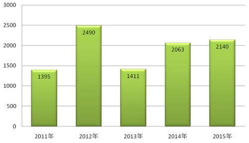一是案件数量呈几何级上升趋势。2015年,非法金融活动犯罪加剧,特别是非法集资案件连续四年出现增长,近二年,非法集资案件数量更是几何级增长。(2011年至2015年非法集资犯罪案件数量见图4)。