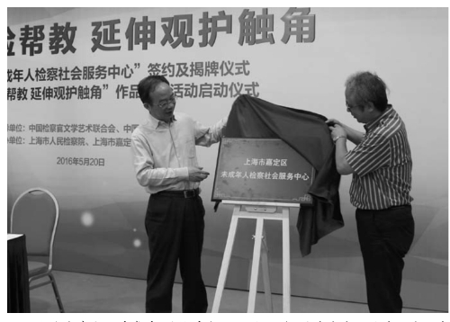上海市嘉定区委常委、政法委书记倪耀明(左)为未成年人检察社会服务中心揭牌 范延杰/摄