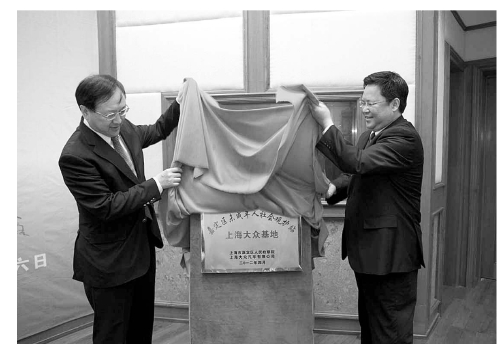 上海市嘉定区检察院党组书记、检察长阮祝军(右)与时任上海大众党委副书记、纪委书记张志勇为大众观护基地揭牌 毛永兴/摄