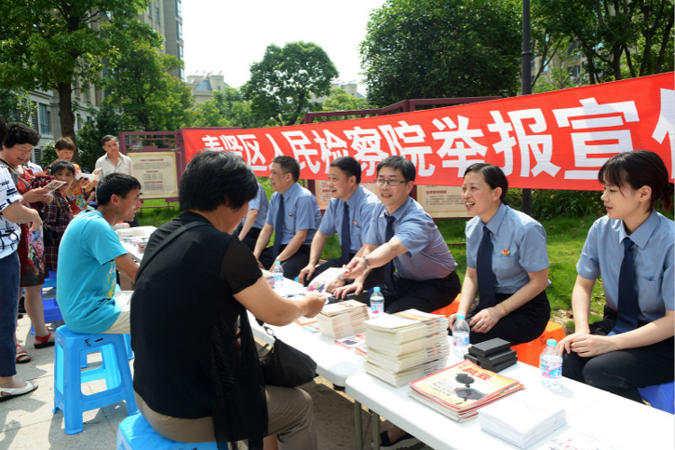 620日至24日,全国检察机关第十八个“举报宣传周”活动拉开帷幕。奉贤区院围绕“加强举报人保护,惩治群众身边腐败”的活动主题,621日,该院副检察长俞德明带领控申、社区、预防等职能部门干警来到南桥镇民旺苑廉政广场,开展形式多样的举报宣传活动。检察干警展出了反映检察职能和近年来查办的职务犯罪等典型案例的宣传版面,耐心解答了现场群众有关法律问题的咨询,并向群众发放了举报宣传资料。