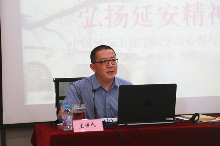 倪峰检察长结合自身在延安干部学院的学习经历和对党史党章的学习体会,回顾了中国共产党在延安时期的光辉历程,阐释了“延安精神”的丰富内涵和时代意义,并指出,在全面依法治国和司法改革的大背景下,检察干警要以“两学一做”学习教育为契机,对照“延安精神”正衣整冠,强化党性修养,践行“三严三实”,当好“延安精神”的传承人,争做优秀共产党员。