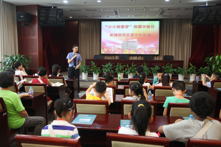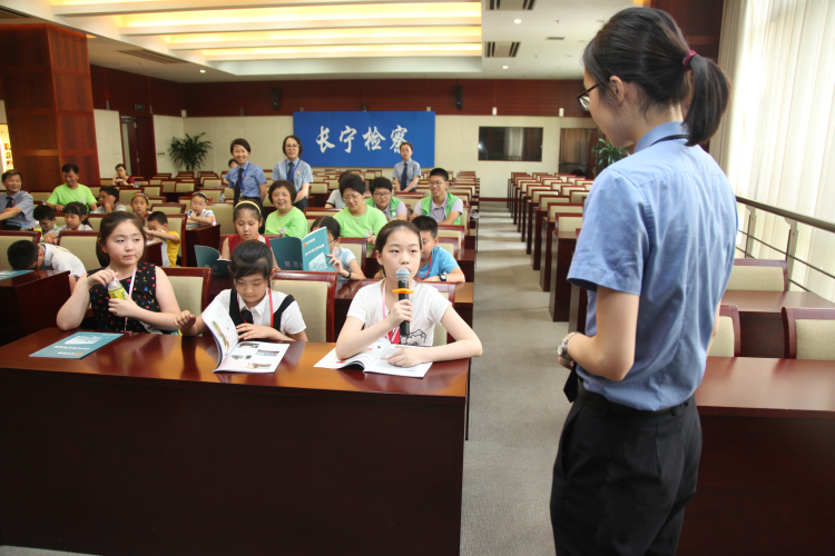 8月2日下午,长宁区检察院举办“小小检察梦”检察开放日活动,该院副检察长叶国平,全国人大代表、虹桥街道虹储居委会党总支书记朱国萍及虹桥街道萍聚爱心暑托班的近40名青少年参加。来院青少年参观了上海未成年人检察工作展示馆,观看了未检微电影,并与检察官开展互动交流。