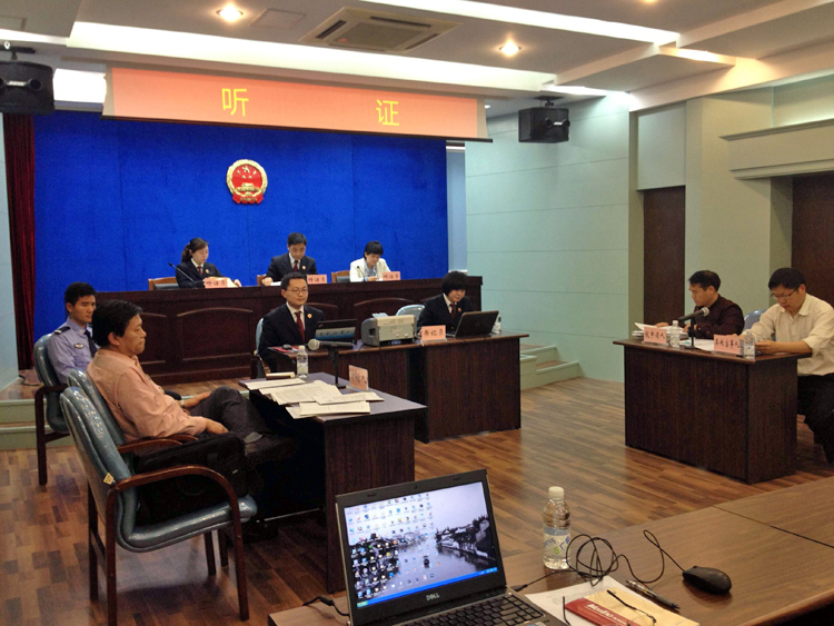 听证现场,由两名检察官和一名有国际货运专业知识背景的市人大代表三人组成的听证员居中而坐,申请人和被申请人分坐两侧,听证现场还有人民监督员、相关部门专业人员等参加旁听。主持听证的检察官听证员宣布听证事由,告知听证员、书记员名单、当事人的权利和义务,询问当事人是否申请回避等听证程序后,由申请人陈述申请监督主张、事实及理由,随后被申请人反驳意见及理由;听证主持人归纳争议焦点后,双方围绕焦点进行陈述、举证、质证和辩论,最后陈述意见。一个半小时的听证紧凑有序,双方充分发表意见,期间听证员还特别对检察官在调查中了解的相关情况,展示给双方当事人辨认并听取意见。听证结束后,听证人员对各方的意见进行评估,将择日宣布检察机关审查决定。