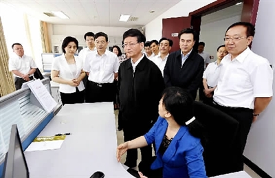 5月27日,中共中央政治局委员、中央政法委书记孟建柱在国家信访局调研。图为孟建柱查看国家信访信息系统运行情况。郝帆 摄