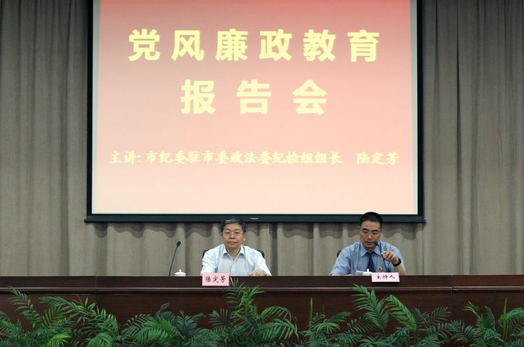 陆定芳组长结合近两年来查处的政法干警典型违纪案例,从政法系统反腐倡廉严峻形势、面临的职业廉政风险、有效防范廉政风险的启示等三个方面入手,全面分析了政法机关党风廉政建设的形势和特点,深入剖析了发生违纪违法行为的原因,阐述了加强政法队伍党风廉政教育的必要性,并提出了党风廉政建设的有效方法及相关措施。