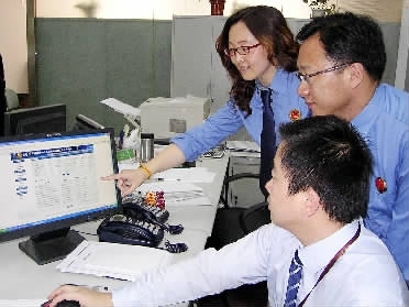 图为浦东新区检察院检察官与软件技术人员开发调试“两法衔接平台”