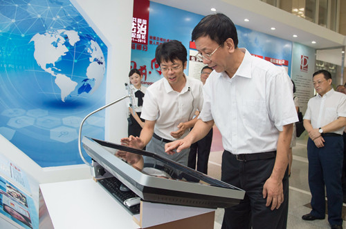 在“平台·服务”展区,科技感十足的8块展板集中展示了检察报业的融媒体平台建设及新兴服务项目,这令一直重视“互联网+检察工作”的曹建明眼前一亮。检察日报社新媒体工作室负责同志介绍说,检察日报社正加快媒体融合发展,每天通过“两微一端”适时向读者推送法治、检察相关的全媒体新闻产品。截至目前,检察日报官方微博在新浪、腾讯、人民网、新华网的总粉丝数近400万,新浪主平台账号粉丝122万。曹建明对此给予充分肯定。