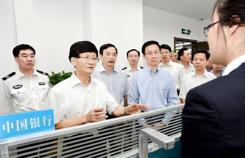 8月31日,中共中央政治局委员、中央政法委书记孟建柱,中共中央政治局委员、上海市委书记韩正在上海考察反电信网络诈骗工作。图为孟建柱、韩正来到上海市反电信网络诈骗中心平台了解案件接报处置等工作情况。郝帆摄