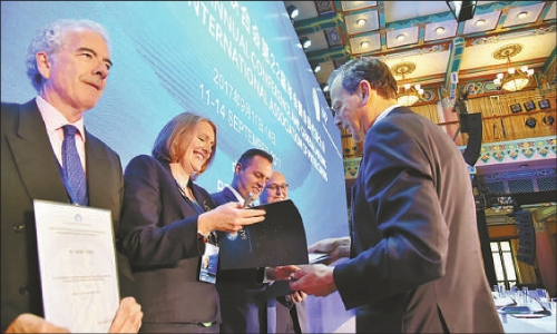 9月13日下午,IAP会员代表大会在京举行。图为国际检察官联合会秘书长汉·莫若为部分在国际司法领域有着卓越成就和作出卓越贡献的代表颁发荣誉证书。 本报记者程丁摄
