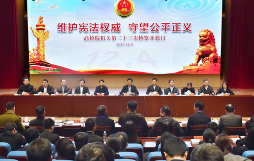 12月4日,最高人民检察院举行主题为“维护宪法权威、守望公平正义”的第二十三次检察开放日活动,最高人民检察院党组书记、检察长曹建明出席座谈会并讲话。程丁摄