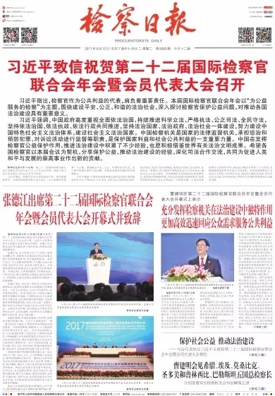 2017年9月11日上午,第二十二届国际检察官联合会年会暨会员代表大会在北京开幕。习近平总书记向大会发来贺信,对会议召开表示祝贺。