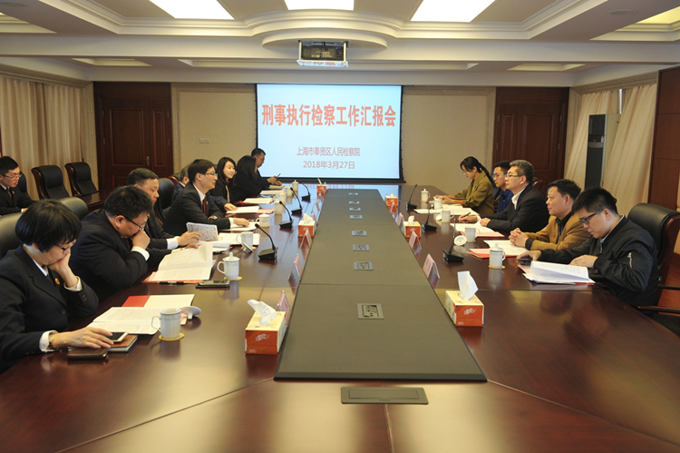 刑事执行检察厅检查组听取奉贤区院刑事执行检察工作汇报,市院监所处处长邹震宇主持,区院党组书记、检察长孙军向李文峰主任汇报创建示范检察室情况、介绍新驻所检察室及看守所建设情况。