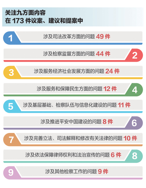 记者注意到,在173件议案、建议和提案中,涉及司法改革方面问题的49件,涉及检察监督方面问题的44件,涉及服务经济社会发展方面问题的24件,涉及服务和保障民生方面问题的12件,涉及基层基础、检察队伍与信息化建设问题的11件,涉及推进平安中国建设问题的8件,涉及完善立法、司法解释和修改有关法律问题的10件,涉及依法保障律师权利和法治宣传问题的6件,涉及其他检察工作问题的9件。