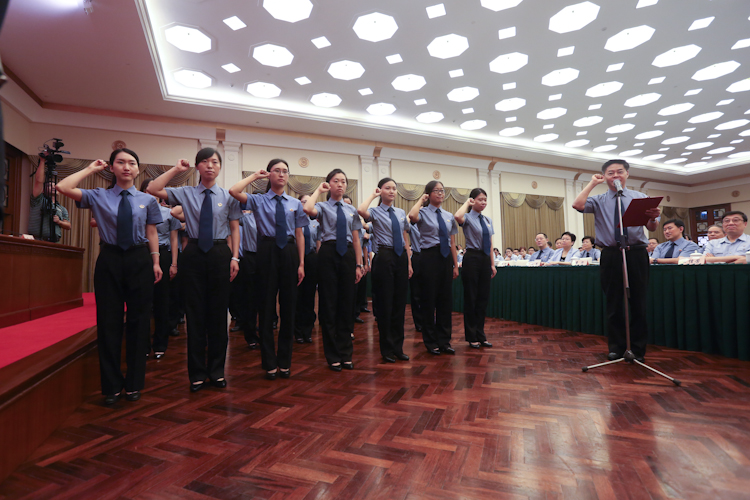 上海289名法官助理、检察官助理9月5日面对国旗庄严宣誓,忠于宪法、忠于法律。这是上海推进司法体制改革先行试点实行人员分类管理任命的首批法官、检察官助理,成为新中国成立以来首批法官助理、检察官助理。